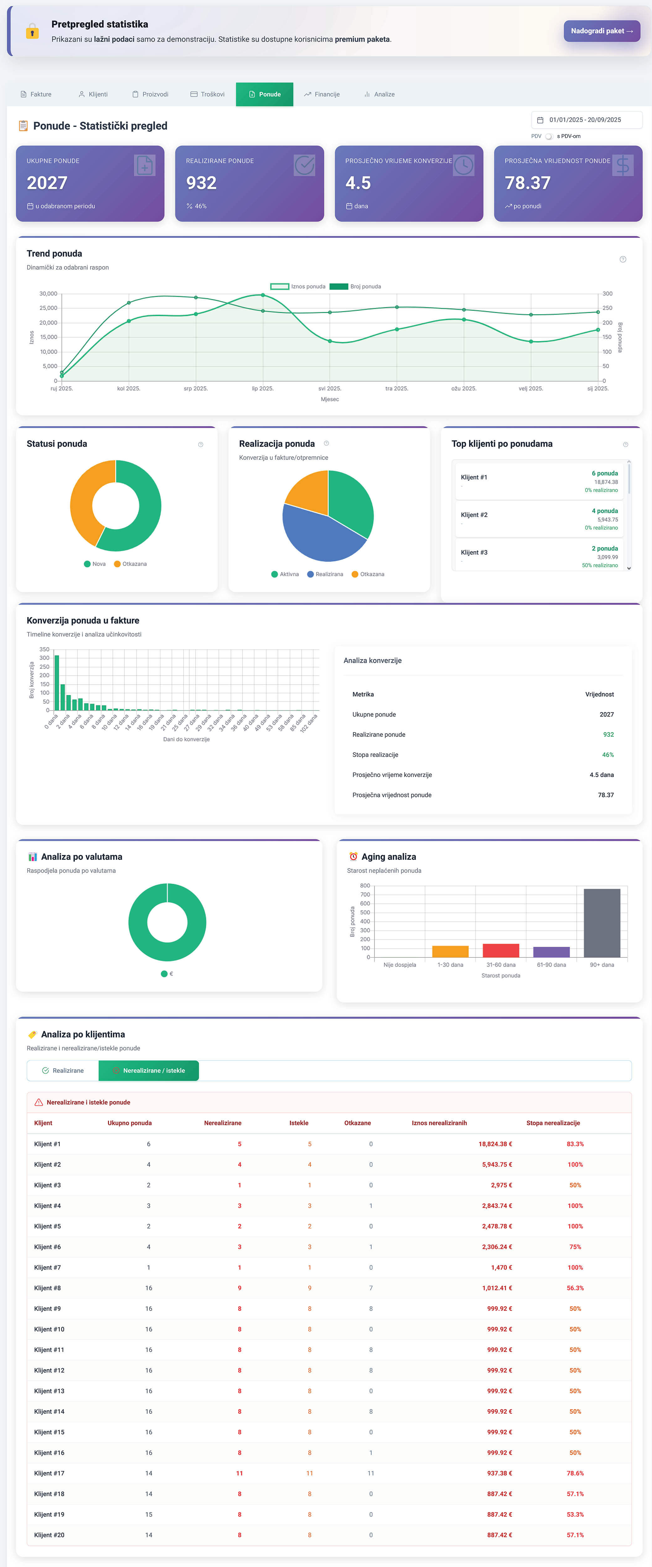 Napredne statistike i analize ponuda koje vam omogućavaju praćenje učinkovitosti prodaje i konverzije.